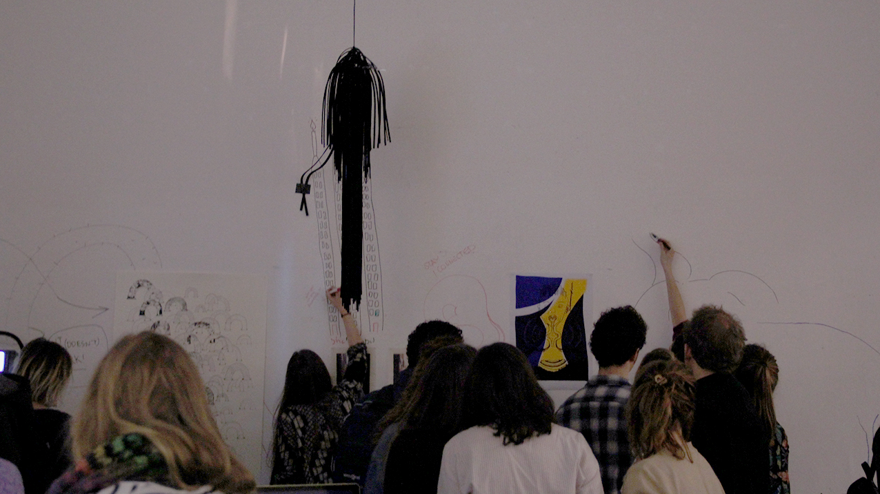 Understanding this situation as an unexpected and undermining shift of the project towards itself, I decided to place all the artworks in the walls of the exhibition room, and during the opening offer to the public to draw, paint, react with pens in the space